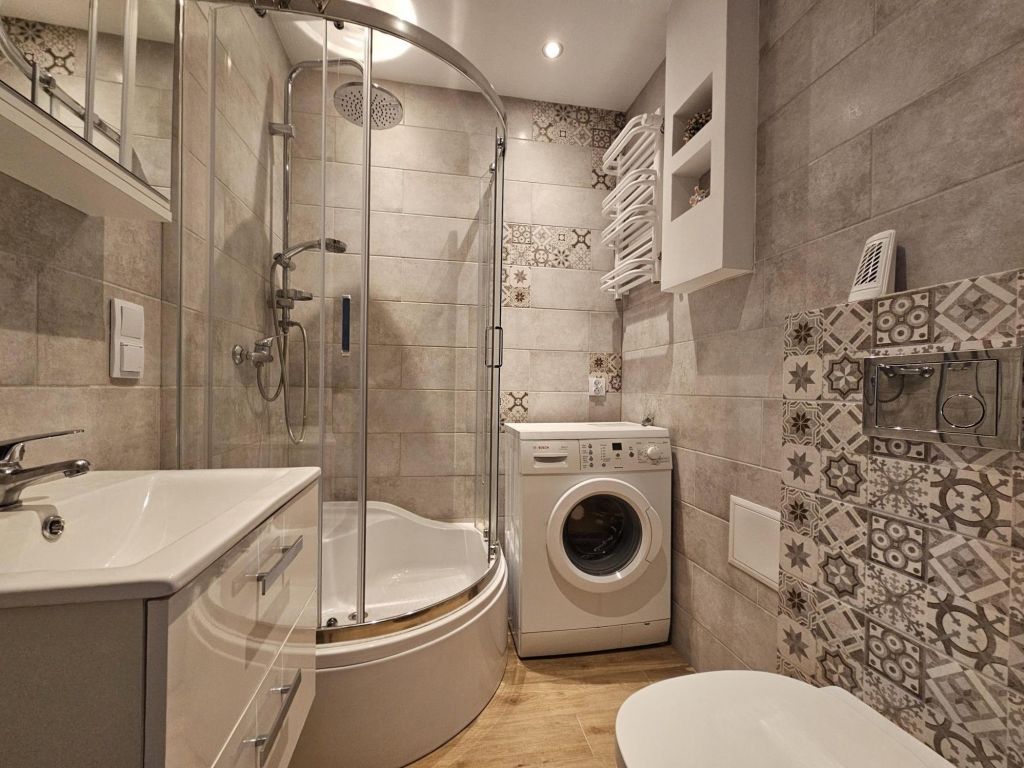 Lokal po kapitalnym remoncie, ok 2 lata temu, nowocześnie wykończony i całkowicie wyposażony: w meble, zabudowę kuchni i przedpokoju, w sprzęt AGD i RTV. Łazienka z wc ,dużą kabiną prysznicową i umywalką.